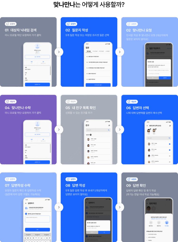 상대방에게 맞나만나 요청을 보내 보세요. 친구들의 답변을 통해 상대에 대한 확신을 얻을 수 있어요