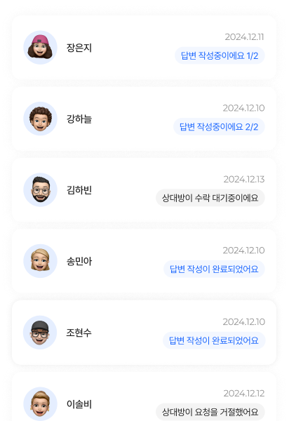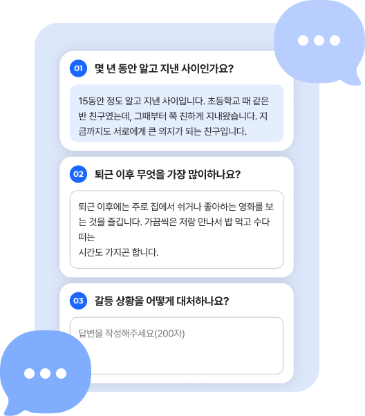 내가 믿는 친구를 선택해, 그들의 답변으로 나를 더 잘 표현할 수 있어요. 친구를 통해 내 이야기가 설득력 있게 전달돼요.