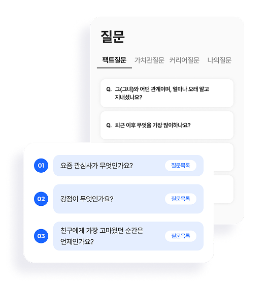 다양한 프리셋 질문을 활용하거나,원하는 대로 커스텀 질문을 만들어요. 모든 상황에 맞는 질문을 준비할 수 있어요.
